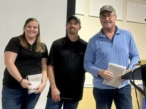 Left to right: Delaware Soybean Board Directors Kellie Yeagar and Matt Szelestei recognize Mark Collins as the 2023 Delaware Soybean Yield Contest winner.